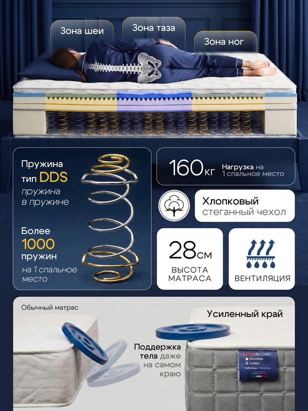 Эффективный пружинный блок. В двуспальном матрасе используется более 700 независимых пружин типа DDS ( пружина в пружине), в односпальном - более 350 двойных пружин DDS. Это обеспечивает точечную поддержку тела и снижает «волновой эффект» при движении.